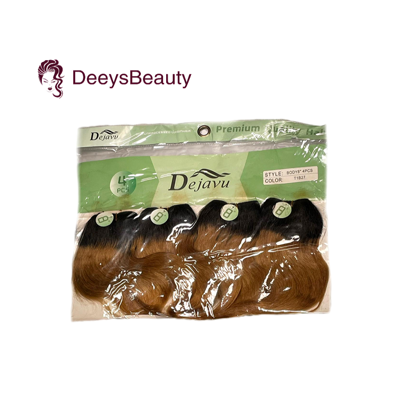 This is a high-quality wavy hair blend of human hair and fibre in color T1B27. Each pack includes 4 bundles and a matching closure, all 8 inches long, for a soft, natural, and effortless look.