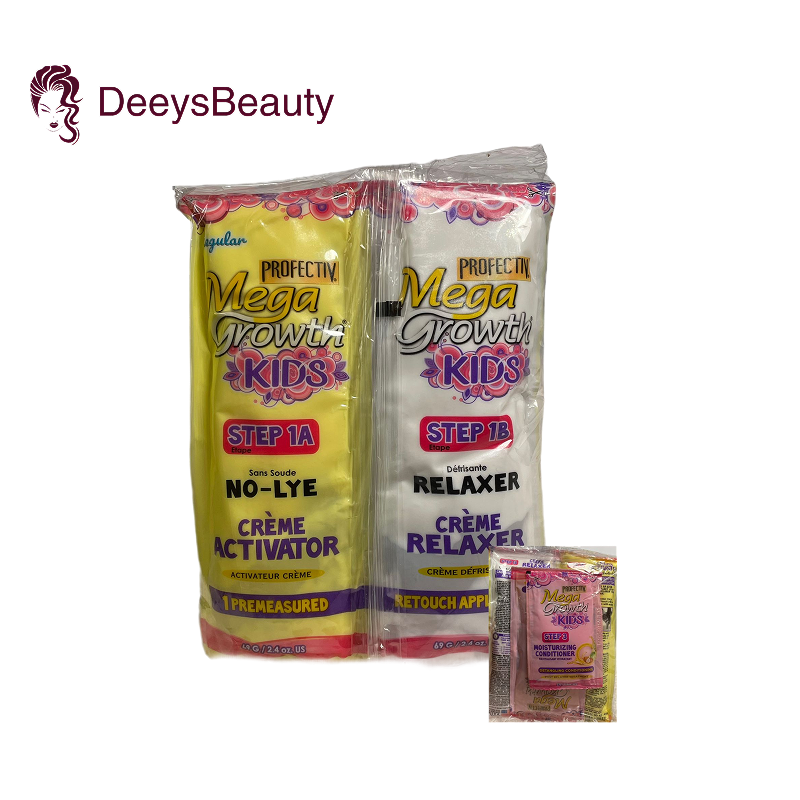 The Kids Mega Growth Relaxer is specially designed for gentle, safe hair care. Each pack includes 1 relaxer, 1 activator, 1 shampoo, and 1 conditioner, helping to soften and manage hair easily. Use according to the instructions on the sachets for the best results.